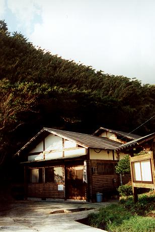ここは明らかに車でもないと来られませんね。ヒッチという手もないわけではないし、島の人は親切だから乗せてはくれるだろうけれど、それにしても車の絶対通行量があまりにも少ないので、なかなかうまくはいきますまい。この島にYHを作ろうと頑張っていらっしゃる人がいるはずですが、YH完成の暁には何とかしてくれるかも知れませんがねえ。メイン村道(この島の主要道路は基本的に全てコンクリート舗装されています)から急な下り道を下りに下り、行き着いた終点からはさらに急な歩道を一気に下って海岸沿いまで降りてきます。ここには集落がありますが、皆村内及び村に関係を持つ人たち所有の湯治小屋で、自分たちが行ったときには2軒だけ人がいましたがあとは無人のようでした。さて、お風呂はそれら家々を通り抜けた海岸沿いにあります。お湯は乳白色で硫黄泉。なかなかに熱い。他にお客さんもいなかったので、ひたすらのんびりします。湯疲れしそうになる頃風呂から上がって、火照った身体をこの風呂場の建物の屋根というか屋上で冷やす心地は何とも捨てがたい 。ついでにここで持参のカップラーメン食べてました。何たってこの島には食堂がない、いや、ないわけではないけれど本村まで行かなければならないから。遠くには三島村や、おそらく開聞岳らしき山も見えました。混んでいたらこうはいかなかっただろうけれど、ほんとうにここは落ち着けます。ちなみにすぐ近くには干潮時のみ入れるという風呂もあるということでしたが、折悪しく満潮。入りに来る順番、西之湯と間違えたなあ。なお、湯治小屋にいらした方とお話させていただくうちに、いつのまにか我々はお部屋にあげてもらい、鹿肉などをごちそうになりました。大変ごちそうさまでした。
