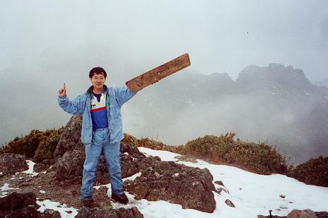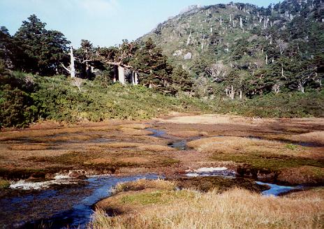 本州の高層湿原を見慣れた人にとっては小さな湿原の一つとしか見えませんが、ここの緯度や高度を考えるとかなり貴重な存在なのでしょう。淀川からの急登を終えて一息つけるところです。もっとも縦走の場合はまだまだ先が長いですから休憩も程々に。特に冬の間は日暮れが早く、新高塚到着と日の入りはいつも同時になってしまいました。ご注意あれ。なお、ここまでの道すがらかなり多くのシャクナゲの株がありますから、花の季節には相当きれいなんでしょう。ここから一息登ると黒味岳の分岐になりますが、残念ながらいまだに往復したことがありません。次回への課題です。また、ここに来る途中の高盤岳展望台からは、スライスした蒲鉾のような岩を頂上に載せた珍しい景色が望めますので是非ご覧あれ。
