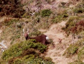 始めていったときは稜線上も風がびゅうびゅうで、この岩屋の下でかなり躊躇しつつ寒さに耐えた記憶があります。ここからは完全に吹きさらしになるので、悪天の場合はここから引き返すことにするのもいいでしょう。なお、岩屋自体は確かにひさしはあっても、風は容赦なく(それでも随分弱いのですが)入り込んできます。ツエルトなしのビバークはきついでしょうね。ただ、晴れていればこのあたりはなかなか気持ちの良いところで、2回目の時はここで兵六餅を食べながら屋久鹿を眺めつつのんびりしてました(ちょっとブレた写真で済みません)。